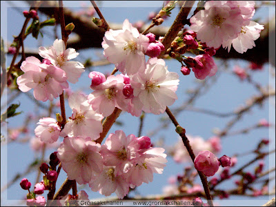 Japanska körsbärsträd, vars blommor hade börjat slå ut igår. Då hade jag inte med mig min systemkamera, så jag bestämde mig för att köra förbi där idag och försöka ta några bra bilder. Jag tycker blommorna är så otroligt fina, men tyvärr brukar blombladen ligga som en vit matta under träder, redan efter några dagar. Blomningen är vacker, men på tok för kortvarig. Det gäller att njuta så länge den varar.